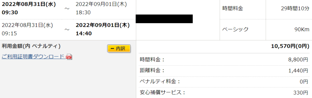 また、22年の9月には、泊りでカーシェアを利用したのですが、それでも利用料金は1万円ちょっとで済んでいます。↓↓