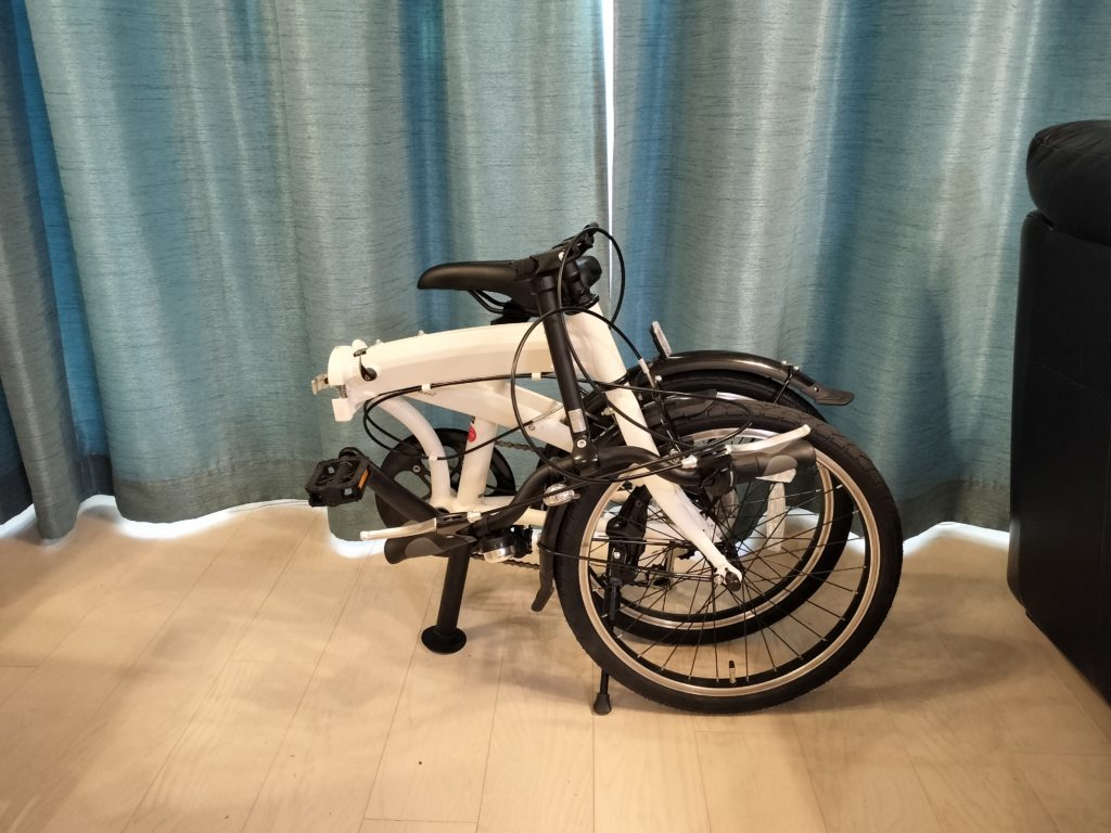 折り畳み式のミニベロで、折りたたむとこんな感じで結構コンパクトになります。